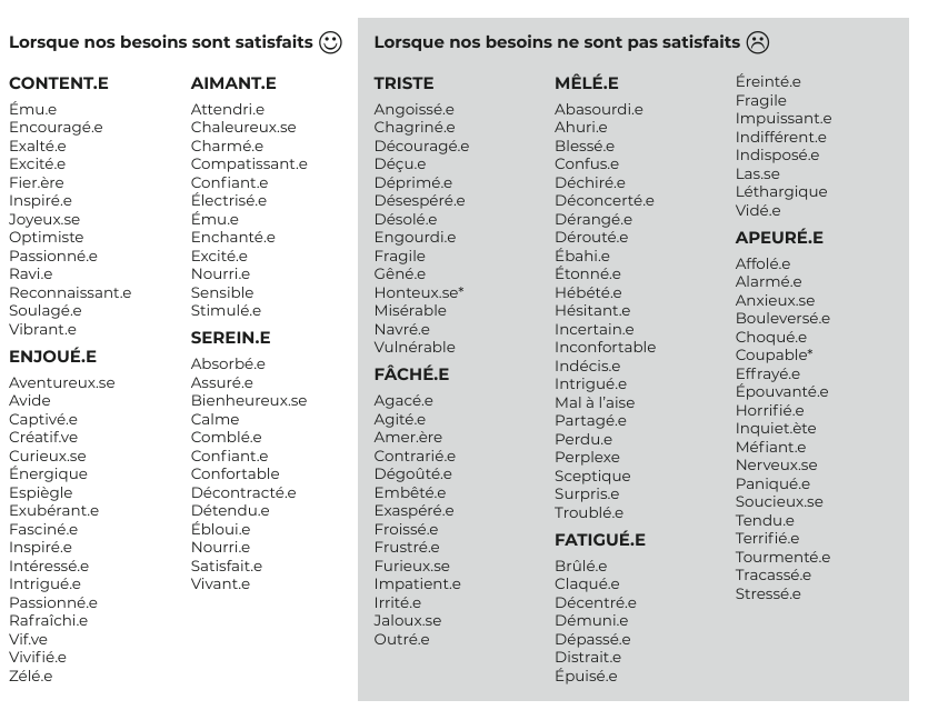Vous pouvez utiliser la liste des besoins de la communication non violente pour identifier lequel est comblé ou au contraire ne l’est pas par rapport à votre émotion ressentie.