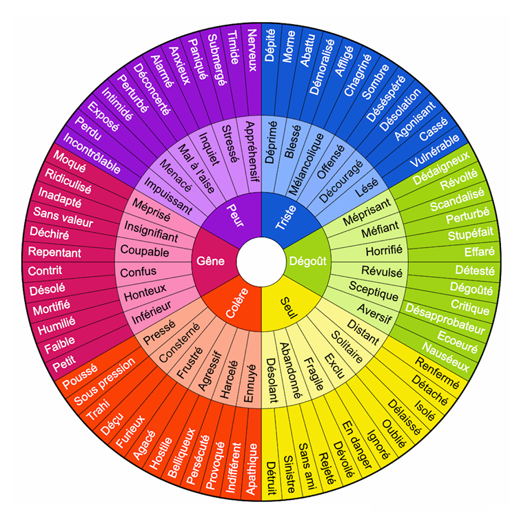 Il s’agit d’utiliser le mot le plus juste possible pour décrire ce que vous ressentez car il existe énormément de nuances au sein de chaque famille d’émotions. Pour ça vous pouvez vous aider de la roue des émotions ci-dessous :